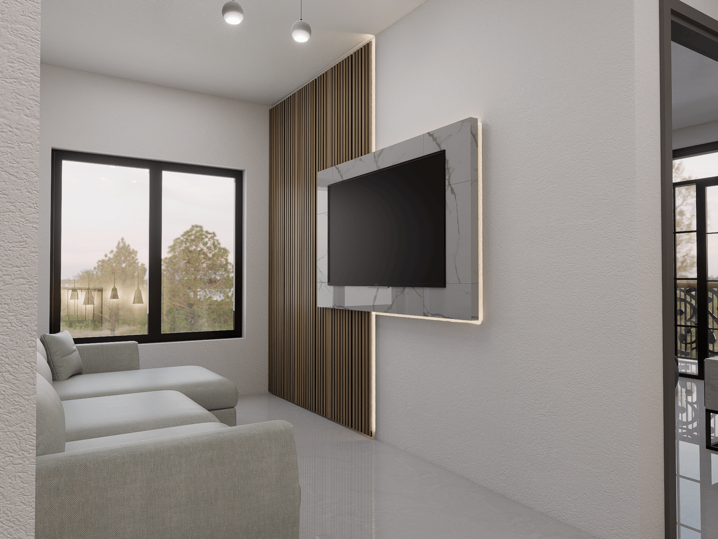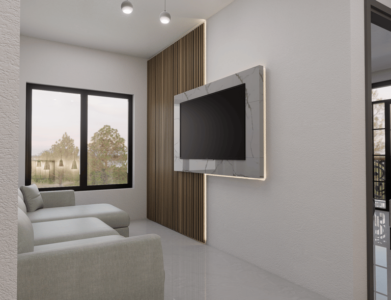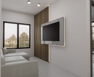 Subiendo por una elegante escalera revestida en madera, llegas a una sala de TV íntima, ideal para desconectarte y disfrutar de la tranquilidad del hogar.