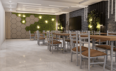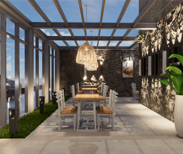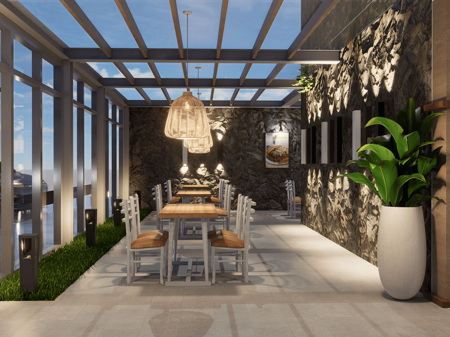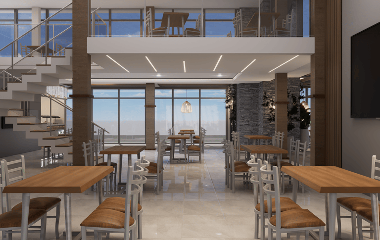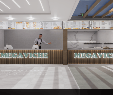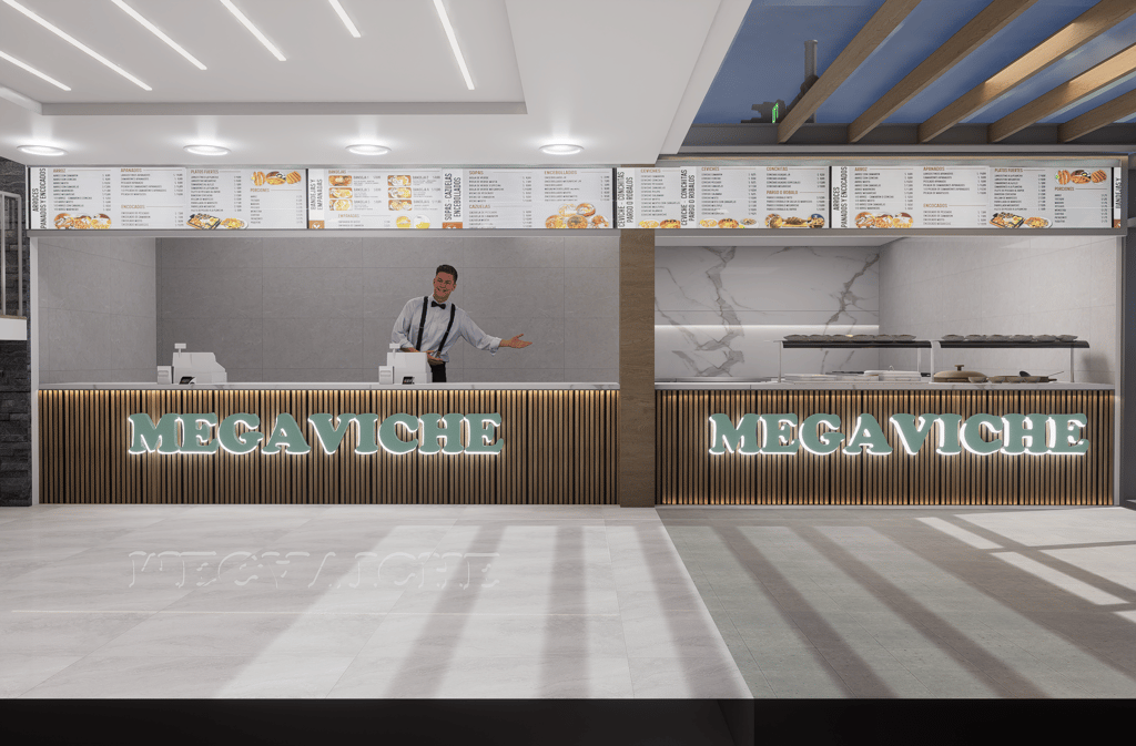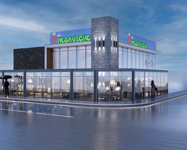 El nuevo Restaurante Megaviche renace con un diseño arquitectónico contemporáneo que combina vidrios panorámicos, texturas en piedra y una iluminación sofisticada, creando un espacio acogedor y visualmente impactante.