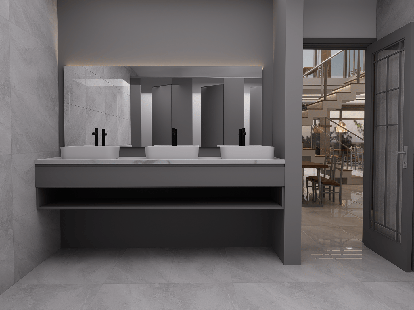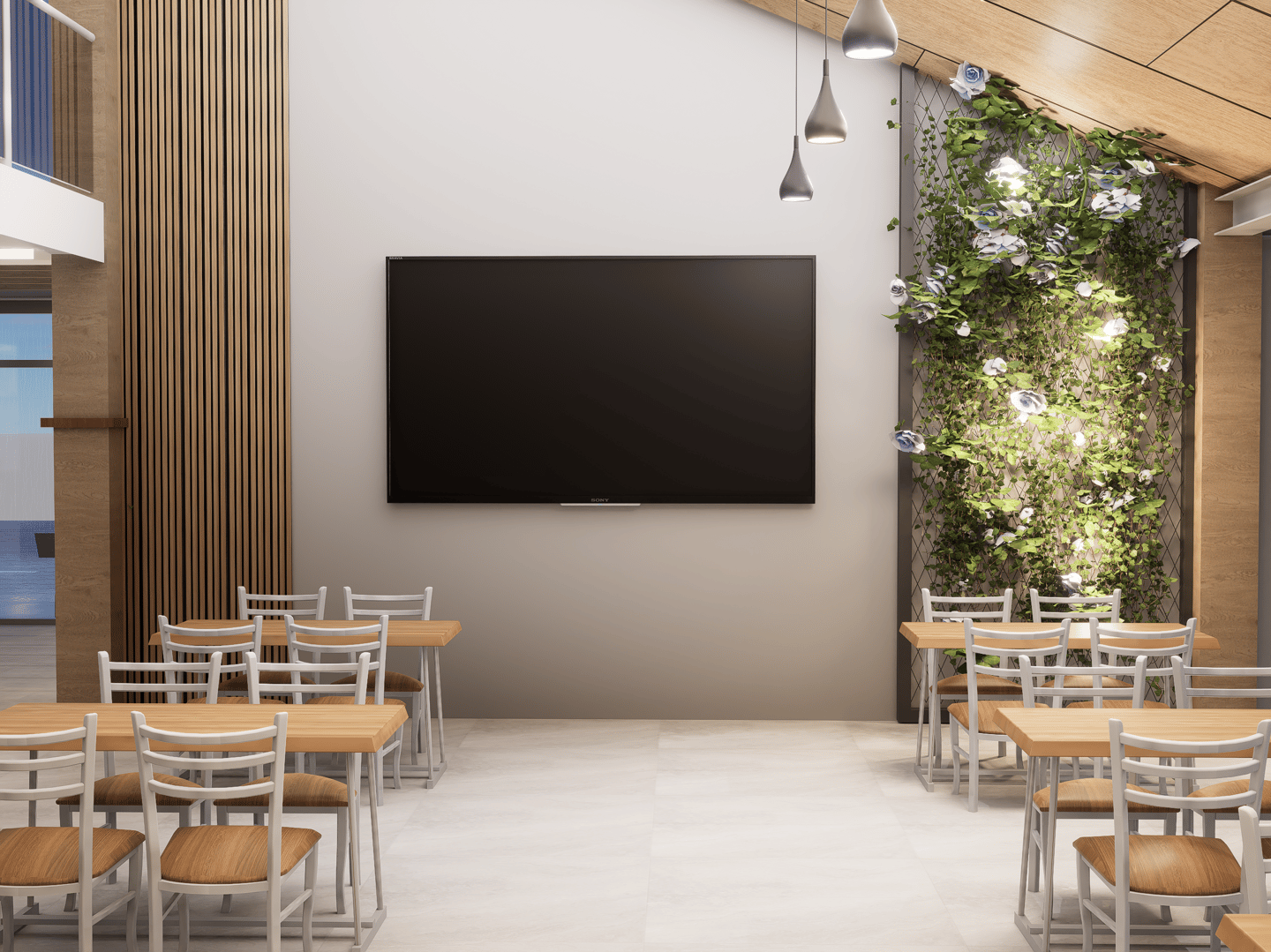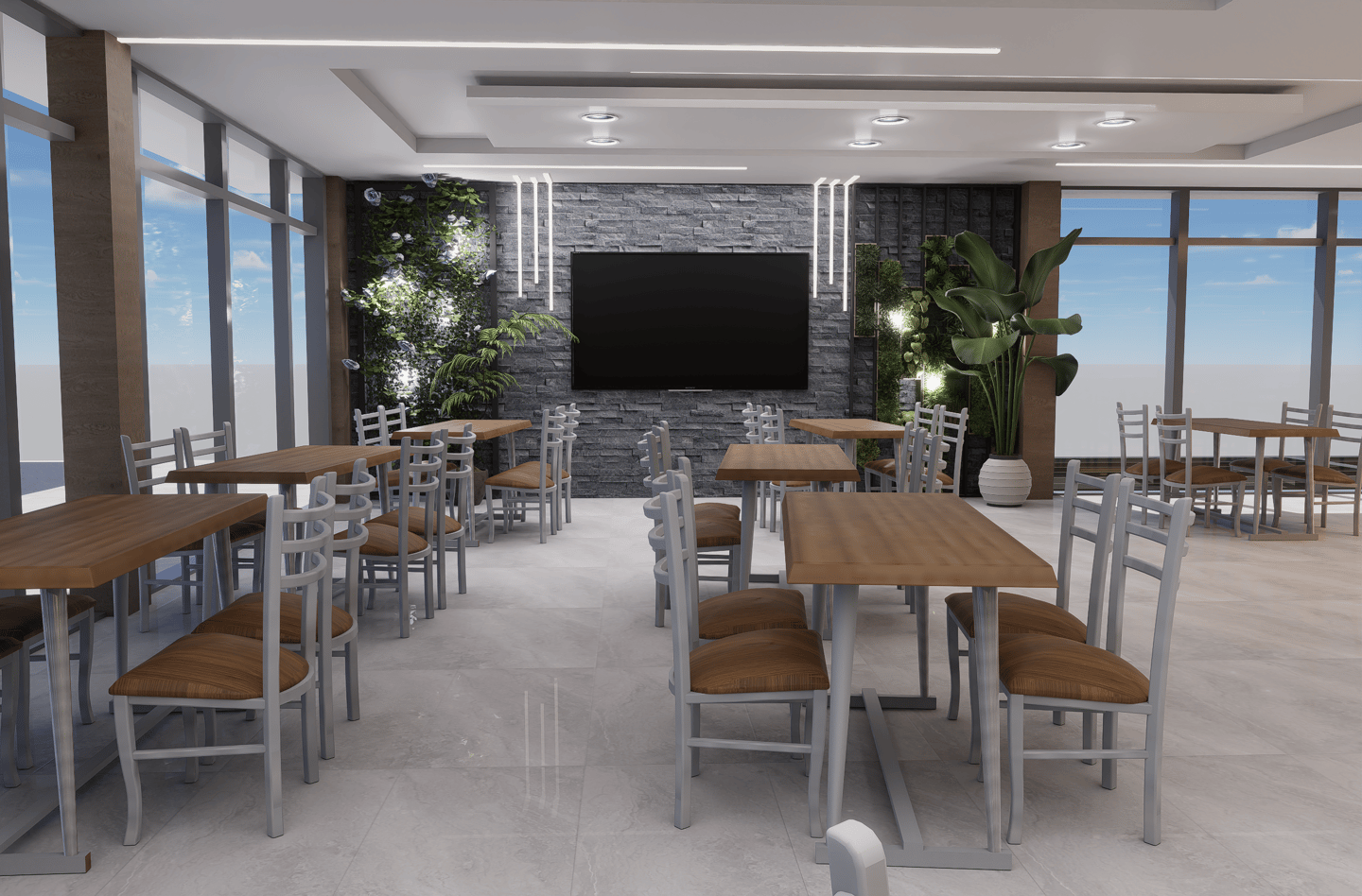 El nuevo Restaurante Megaviche renace con un diseño arquitectónico contemporáneo que combina vidrios panorámicos, texturas en piedra y una iluminación sofisticada, creando un espacio acogedor y visualmente impactante.