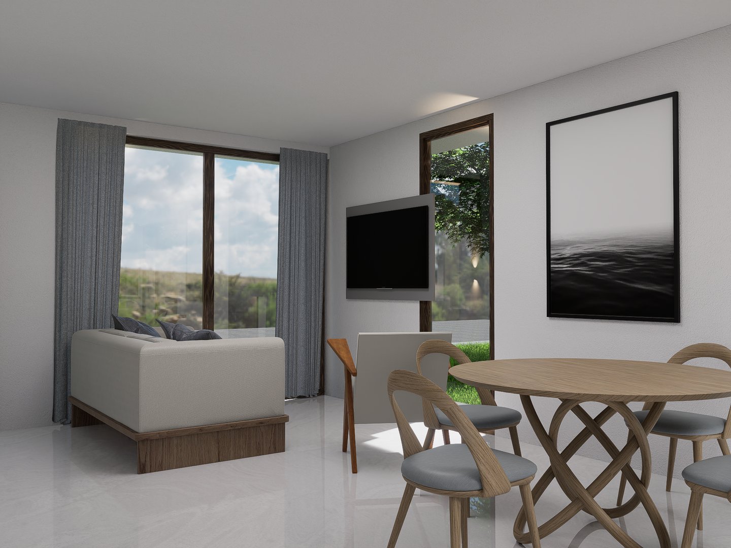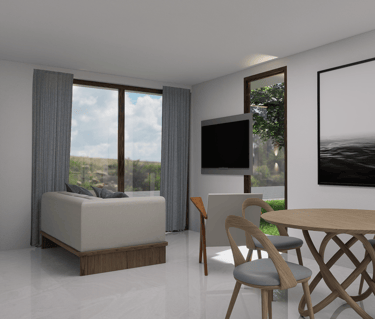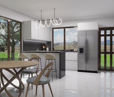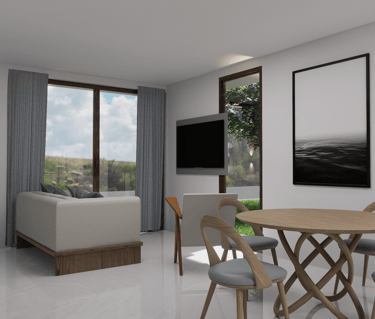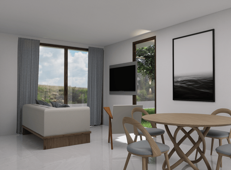 Imagina disfrutar aquí de tu serie favorita, rodeado de un ambiente moderno, cálido y lleno de luz natural. La zona social se integra en un solo ambiente funcional, conectando sala, comedor y cocina para crear un espacio ideal donde compartir y disfrutar en familia.
