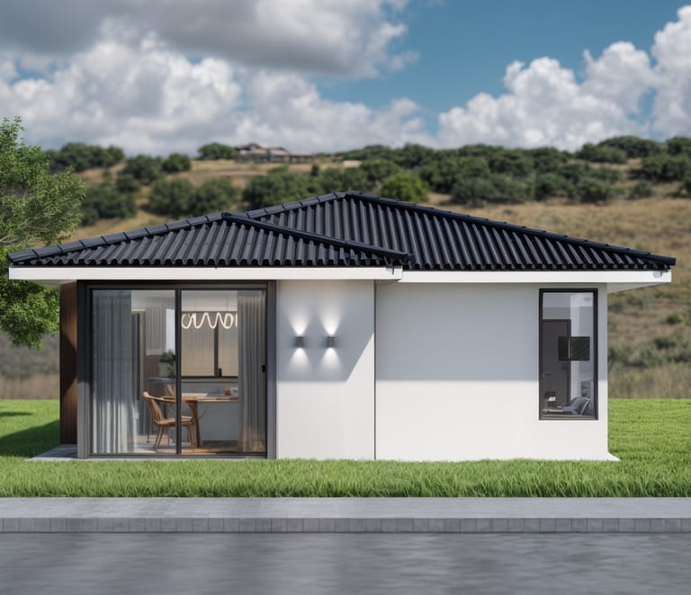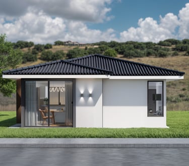 Esta hermosa casa de una planta combina elegancia y sencillez en su fachada. Su diseño moderno con tonos neutros y techo oscuro resalta sobre el verde del césped que la rodea, creando una armonía perfecta con la naturaleza.