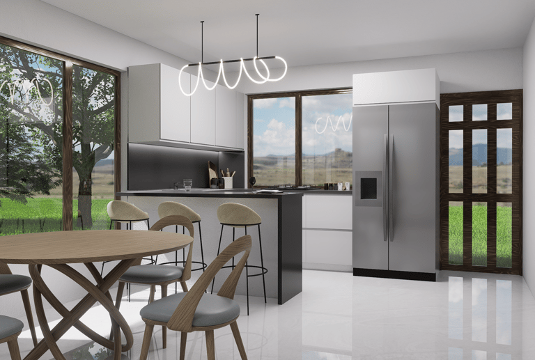 El comedor, diseñado para cuatro personas, combina elegancia y modernidad. Mientras que la cocina destaca por su estilo contemporáneo: muebles blancos que reflejan limpieza y amplitud, y una encimera gris que aporta un toque de distinción.